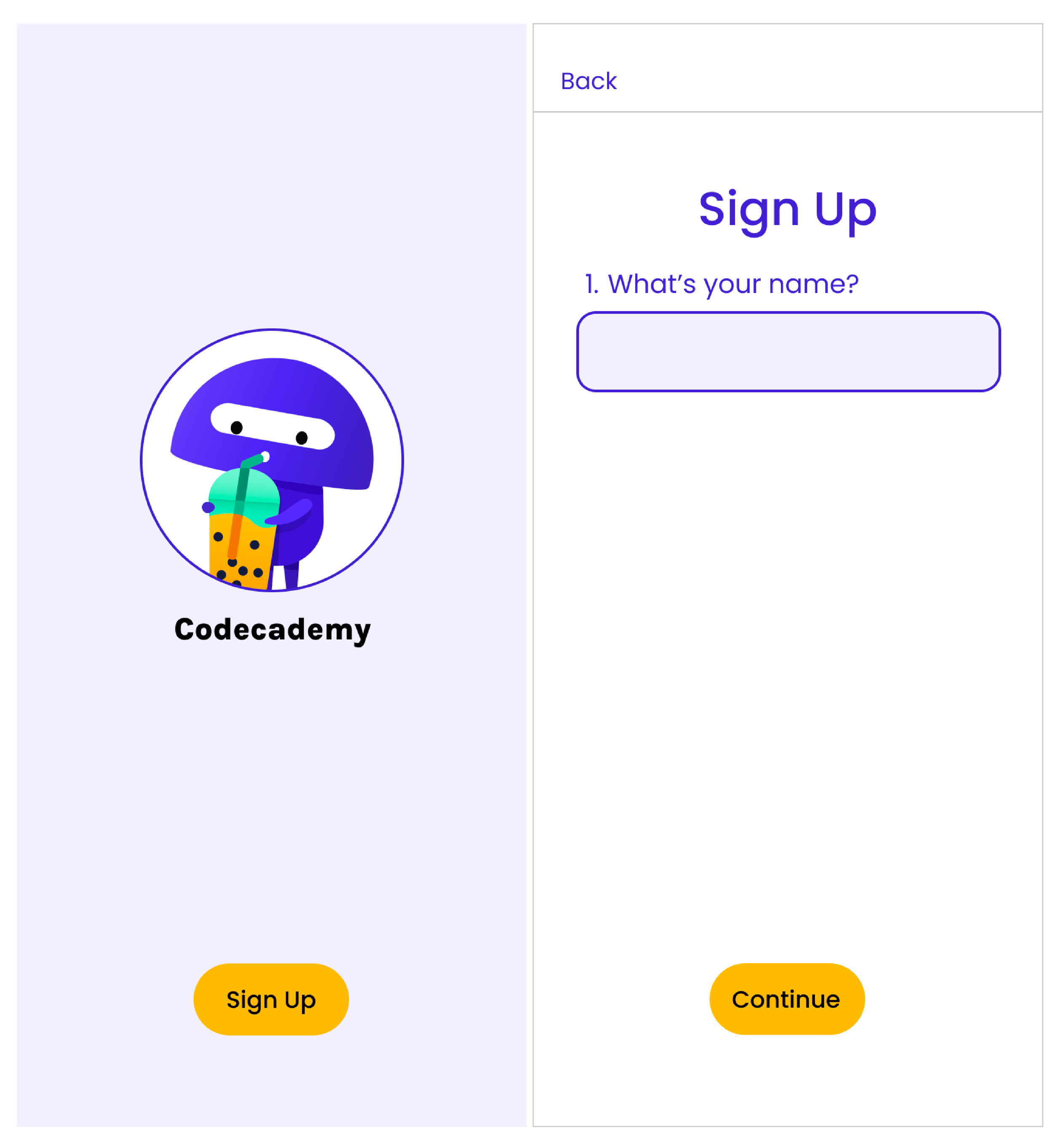The app design on the right is for an intro and sign-up page for the Codecademy app. This sleek and minimalistic design gets the job done, and reating this helped me understand the basics of app design.